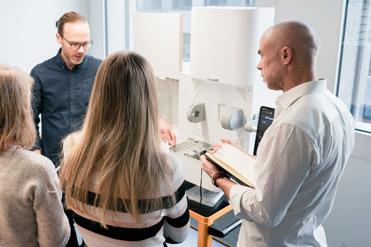 2 designers and 2 end-users stand in a medical lab and discuss the pain points and delighters of a medical device through in-person user research