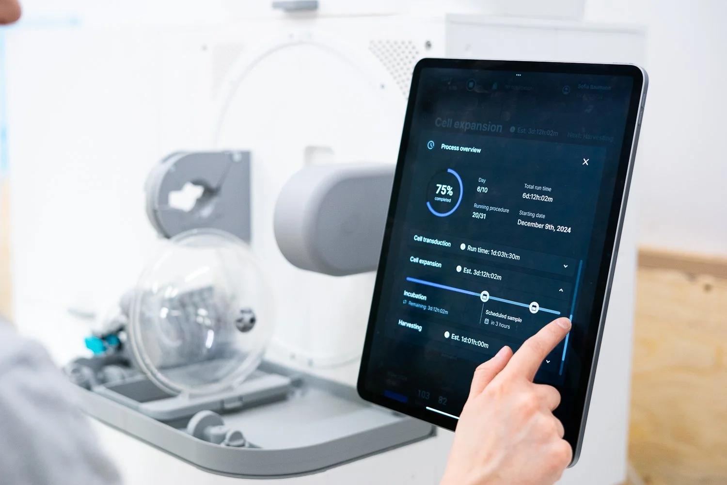 A hand touches and interacts with a tablet shaped touch screen showing the user-interface of a medical device