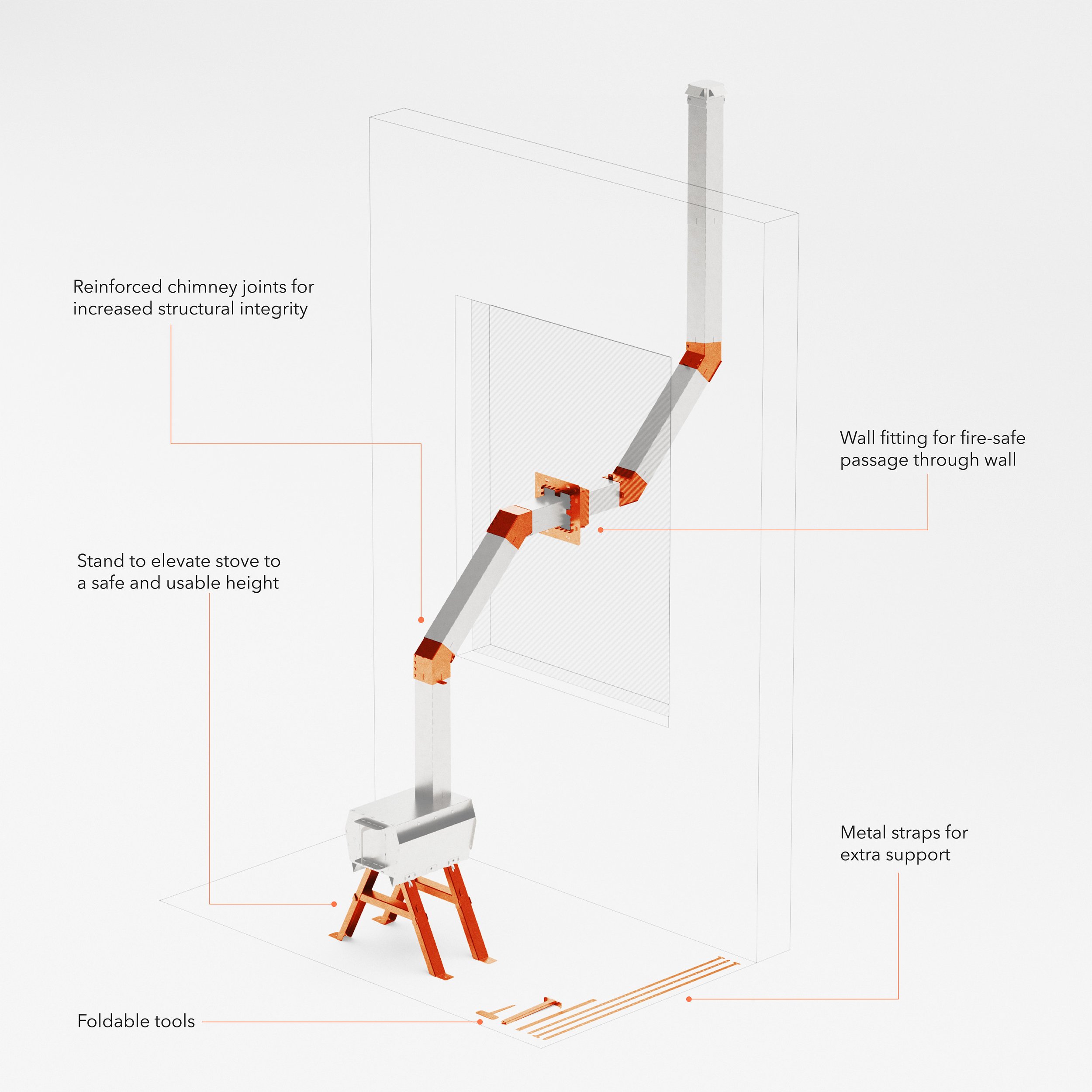Developed in collaboration with Cut & Fold, Fjaryl developed the Installation Kit that enables safe use of the FirePipe stove in real homes and emergency environments. The installation kit - a stand, wall fitting, metal straps, accessories and reinforced chimney joints - is engineered to perform under real-world conditions.